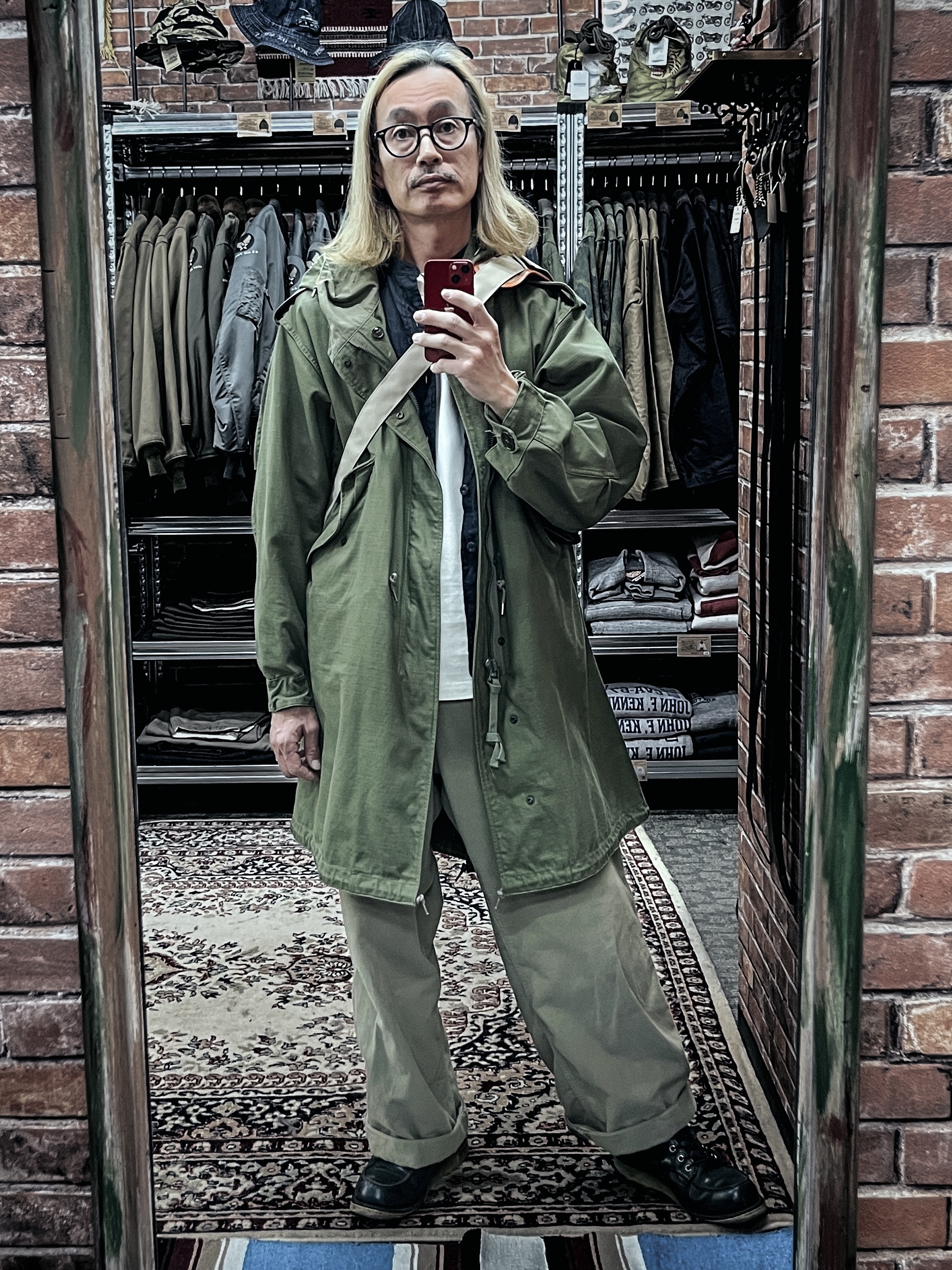 ミリタリーのロングコートにワイドチノでイタリアオヤジの完成